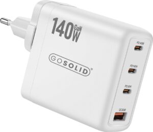 GO SOLID! Caricabatterie 140W compatto con 4 porte (3× USB-C, 1× USB-A). Ricarica rapida con Power Delivery e compatibilità Quick Charge per smartphone, tablet e laptop. Distribuzione intelligente della potenza per caricare più dispositivi contemporaneamente alla velocità ottimale. Protezioni contro sovracorrente, sovratensione e cortocircuito per una ricarica sicura. Design compatto e leggero, ideale per casa, ufficio e viaggi. Compatibile con Apple, Samsung, Google, Huawei, Xiaomi, OnePlus, Dell, HP e Lenovo.