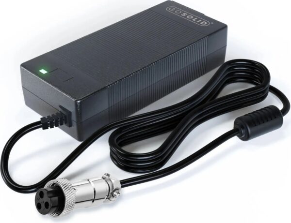 Caricabatterie GO SOLID! compatto e resistente per e-bike. Compatibile con Koolux X9. Ricarica rapida e sicura con protezioni contro sovratensione, sovracorrente e cortocircuito. Perfetto come caricabatterie di ricambio o aggiuntivo, include cavo di ricarica, plug-and-play.